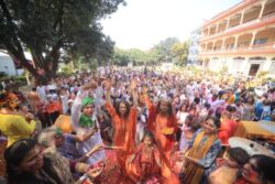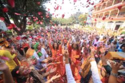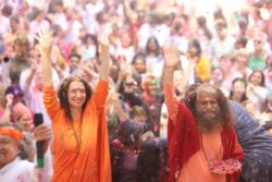 Giving a message of an eco-friendly, green and natural Holi celebration with natural, organic colours and flowers showered in the Yoga Gardens of Parmarth Niketan in a very special and one-of-a-kind divine and sacred Holi. Thereafter participants joined Pujya Swamiji, Pujya Sadhviji and Sivamaniji in rallying down to the holy banks of Mother Ganga for an incredibly special and deeply refreshing Maa Ganga Snan.