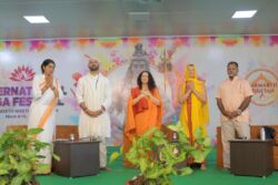 The International Yoga Festival (IYF) at Parmarth Niketan in Rishikesh has officially commenced with a stunning opening ceremony and a serene meditation session, followed by a soulful Sunrise chanting, and culminated in a sacred evening kirtan featuring Gauri Vani and other esteemed artists at the Shankar Bhagwan Ghat.