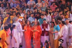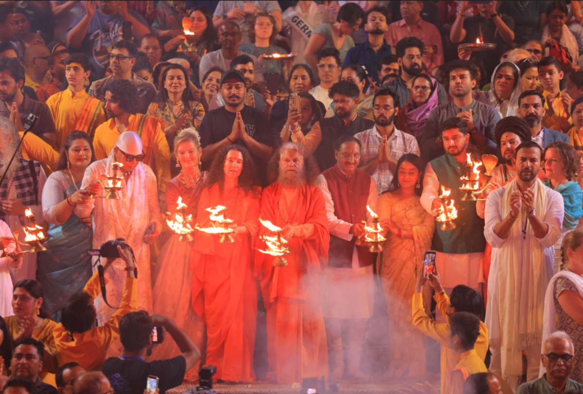 As the music flowed, the sacred Ganga Yagna (Havan) and the world-famous Parmarth Niketan Ganga Aarti began, led by Swami Chidanand Saraswati and Sadhvi Bhagawati Saraswati. Drums Shivamani’s dynamic percussion seamlessly intertwined with the devotional chants of the Aarti, transforming the ceremony into a deeply immersive spiritual experience.