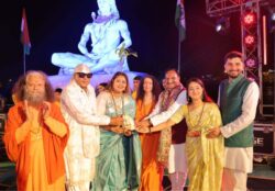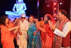 Following the aarti, renowned Shivamani and singer Runaa Rizvii delivered a powerful musical performance on the banks of Ma Ganga. They were given a Shawl, Rudraksh plant and Rudraksh Mala by Pujya Swamiji, Pujya Sadhviji and Honorable Dr. Ramesh Pokhriyal Nishank.